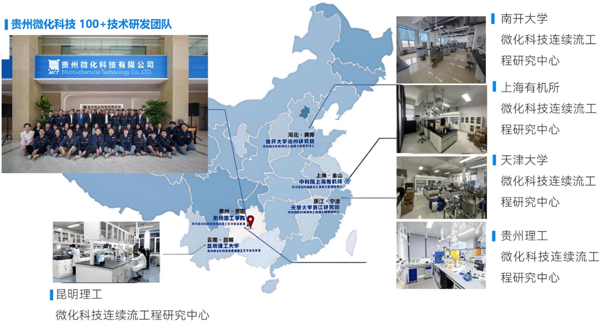 贵州微化科技成立于2013 年,是国内连续流微反应器的核心探索者与实践者,专注化学反应特征与反应器结合研究,针对不同化学反应,研发不同结构形式的反应器,强化反应三传一反。