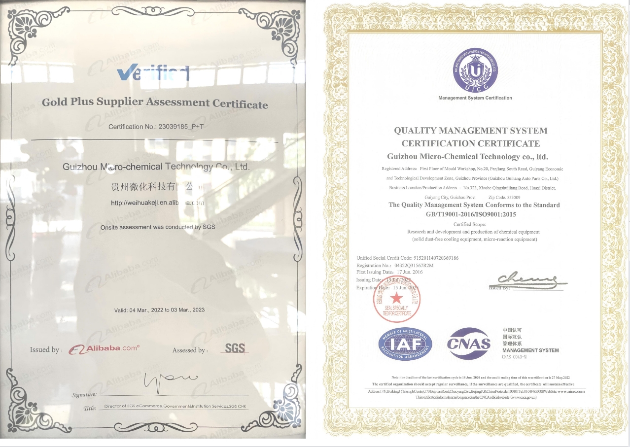 微化科技荣获国际权威机构 SGS “Gold plus supplier assessment certificate”(金牌供应商评估认证),并通过IOS9001国际质量管理体系认证。从物料采购、装备生产到质量检测,每一个流程每一道工序都有严格的质量检测与监控,确保装备生产完全符合高质量标准,始终如一地为您提供质量可靠、性能稳定的化工装备。
